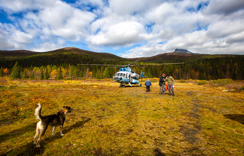Наш вертолет приземлился на вертолетную площадку рядом с приютом. Его весело встречает местный пёс по кличке Босс: