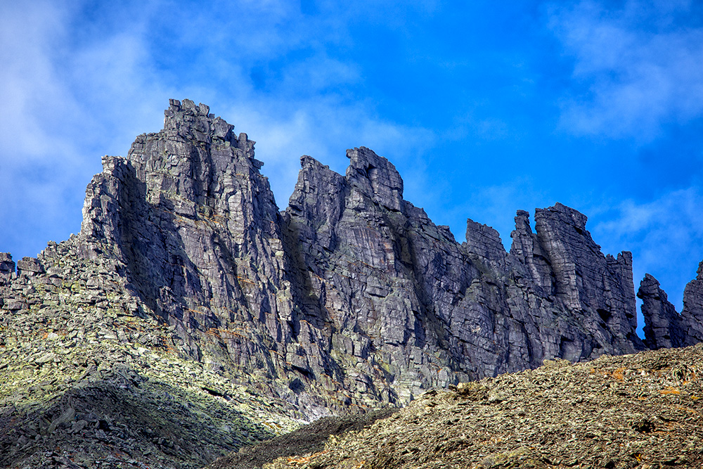До зубцов нужно подниматься резко вверх по курумнику. Мы не пошли, фото сделано телеобъективом: