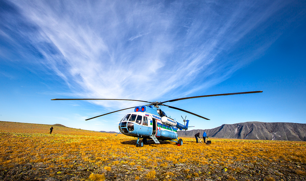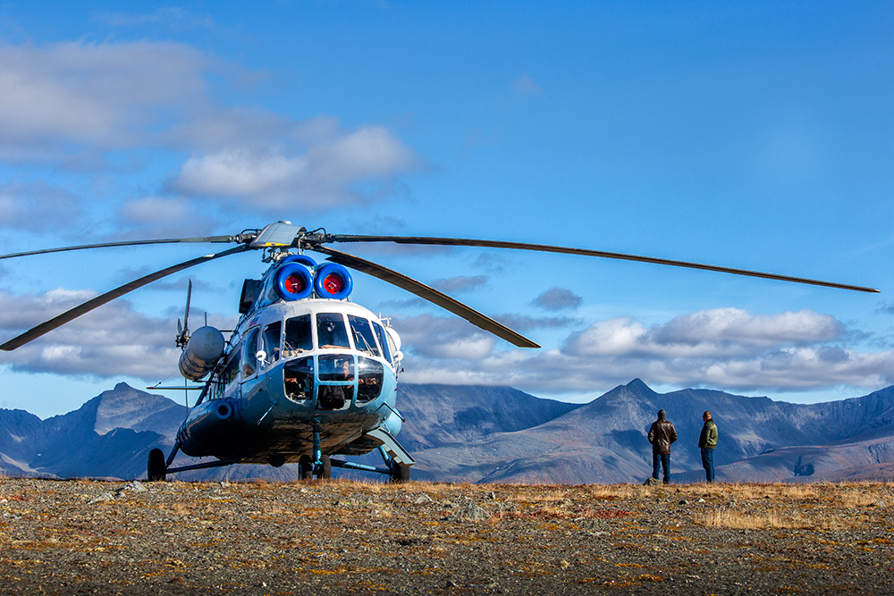 Утром следующего дня погода была хорошей, и мы отправились в аэропорт Усинска, откуда стартовал наш вертолетный тур. Нас заранее предупреждали, что при регистрации на рейс будет жесткий весовой контроль багажа. Ограничение - 15 кг на всё (багаж + ручная кладь). Это очень мало, особенно учитывая то, что с собой пришлось взять ноутбук, ведь ты не знаешь, когда и куда вернешься (по погодным условиям туристов могут вернуть в другой населенный пункт). Всё, что превышает данную норму, можно надеть на себя. Я так и сделала: несколько кофт, самые тяжелые треккинговые ботинки, фотокамера на шее, объектив в кармане, и всё равно - 16 кг. Однако по факту на перевес никто не смотрел. Транспортный вертолет МИ-8, на котором совершается перелет, способен перевозить грузы до 4 тонн. Помимо участников тура, их вещей, он еще везет еду и дизель для инспекторов национального парка, которые живут (и работают) в приюте "Манарага".