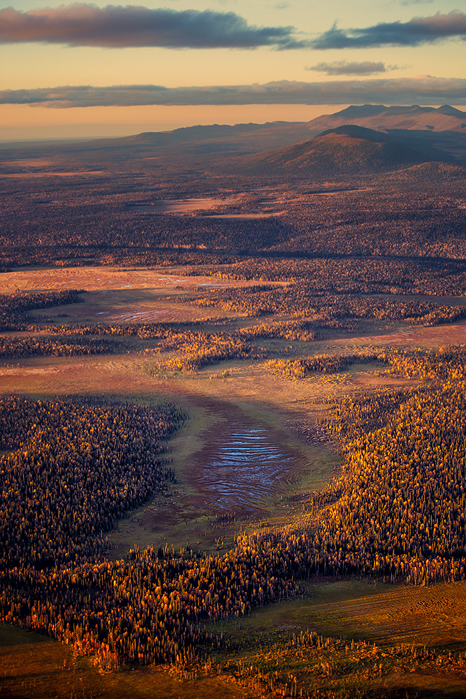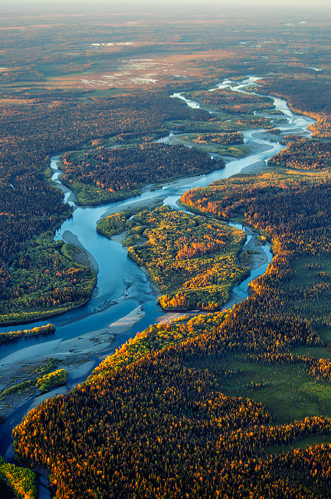 Вид из иллюминатора вертолета на бескрайние болота и причудливые изгибы рек Республики Коми: